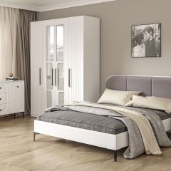 Кровать установлена на высокие ножки, что делает конструкцию лёгкой и воздушной, изголовье кровати декорировано пышным мягким элементом. Матрас укладывается на ортопедическое основание с гнутоклееными ламелями.